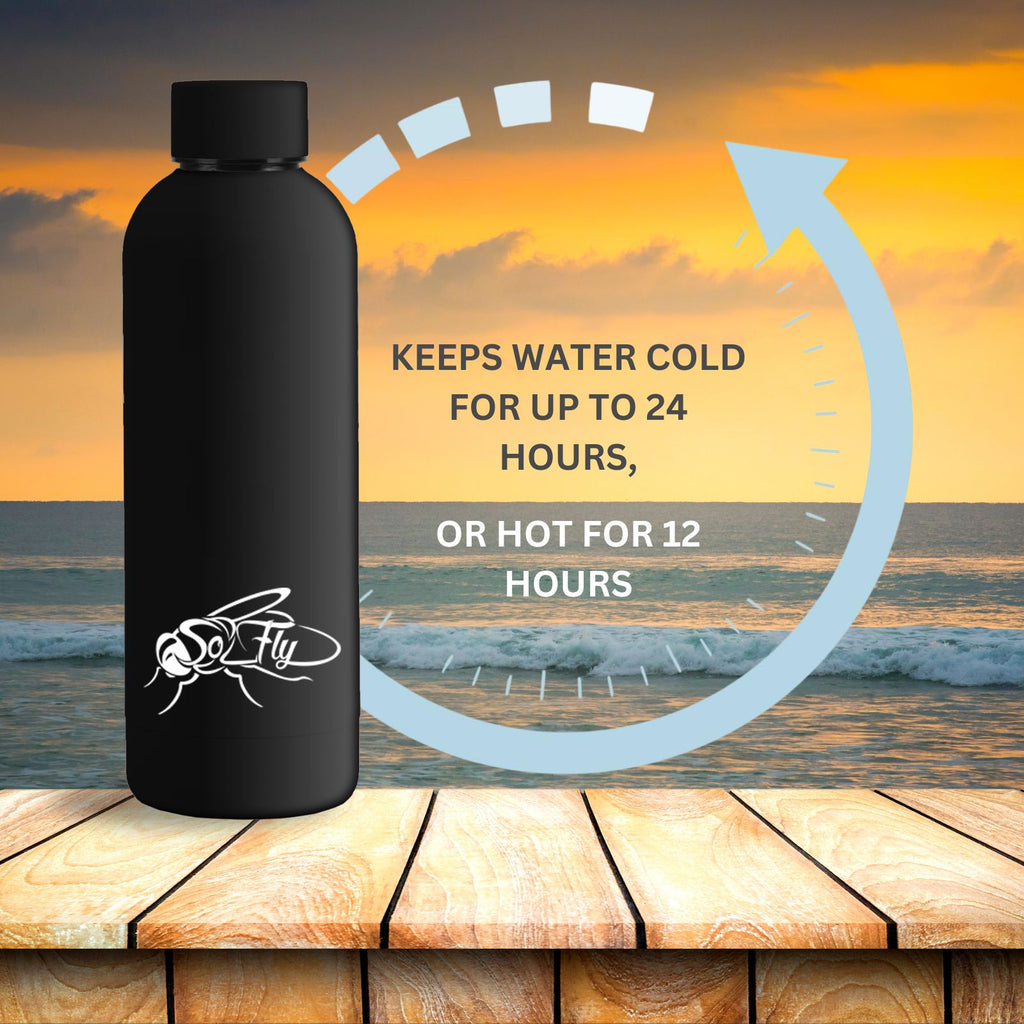 The So Fly Stainless Steel Sports Water Bottle is copper layer and vacuum insulated to your drink cold for 24 hours and hot for 12 hrs. Its vibrant colors look great for any travel.
